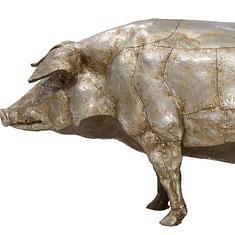 Espino se decantó por este diseño para hacer un guiño a la empresa que patrocina la escultura, Desguaces Bru. «Pensé en un cerdo despiezado de la manera clásica, aunque me he permitido algún lujo y si lo ve un carnicero se reiría mucho. Lo he desguazado y le he dado un fondo marrón, como si fuera oxidado, para que tenga profundidad. Luego he pintado los cuarterones plata y he simulado unos remaches. Cuando hice eso no me gustó, porque quedó demasiado plateado y como tiene textura no tiene sentido una chapa tan nueva, así que le di una especie de pátina de color óxido que da un efecto claroscuro», dice el artista, que considera que la escultura está realmente conseguida.