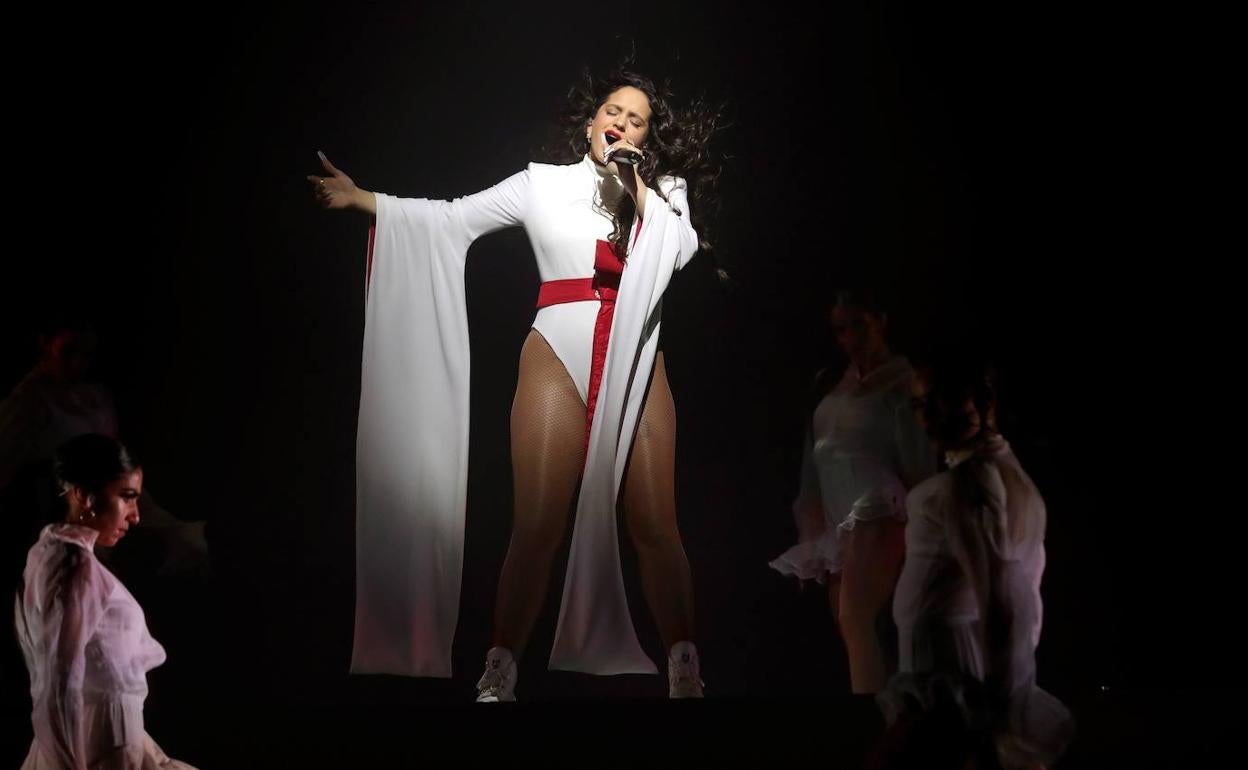 Quince mil almas esperaban impacientes a una joven de 26 años que hace ahora poco más de un año se sacaba de la manga 'El mal querer', un disco arriesgado, conceptual y experimental, que no escatima en éxitos, pero que de fácil no tiene nada. A las 21:08 horas el recinto se fundía a negro y tras cinco minutos de júbilo enfervorecido y locura colectiva, Rosalía y el conjunto que la acompañaría durante toda la noche salió al escenario. A la izquierda, un coro flamenco formado por dos hombres y dos mujeres; a la derecha, el Guincho, coproductor del álbum que la ha puesto en órbita, amarrado a un teclado, un disparador de samples y un goliat para la percusión, y rodeándola, de blanco impoluto, seis bailarinas. Ella, con el pelo suelto, también de blanco, con unas mangas que casi llegaban al suelo y que trazaban extraños dibujos cuando bailaba, y una suerte de lazo rojo a modo de cinturón.