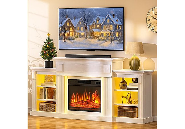 Este mueble chimenea YITAHOME de 72 pulgadas incluye almacenamiento y un efecto de llama LED 3D ajustable en varios colores. El control remoto y la app permiten ajustar la temperatura, el brillo y el temporizador. Cuenta con protección contra sobrecalentamiento y estantes regulables.