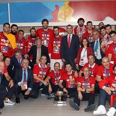 "Habéis hecho feliz a muchísimos españoles, a todos los españoles", dijo Rajoy, que bromeó al señalar que "ha sido nuestra medalla número 12". "Sólo nos superan la URSS y Yugoslavia, pero como no existen, ya nadie nos supera. Vosotros sabéis que fue difícil. La primera fase fue complicada, pero a base de esfuerzo y sacrificio, era la medalla de la fe, como dijo el capitán. La del equipo, la fuerza, el talento". "Habéis hecho algo que es muy difícil: hacer feliz a mucha gente y no pedir nada a cambio", apuntó Rajoy.