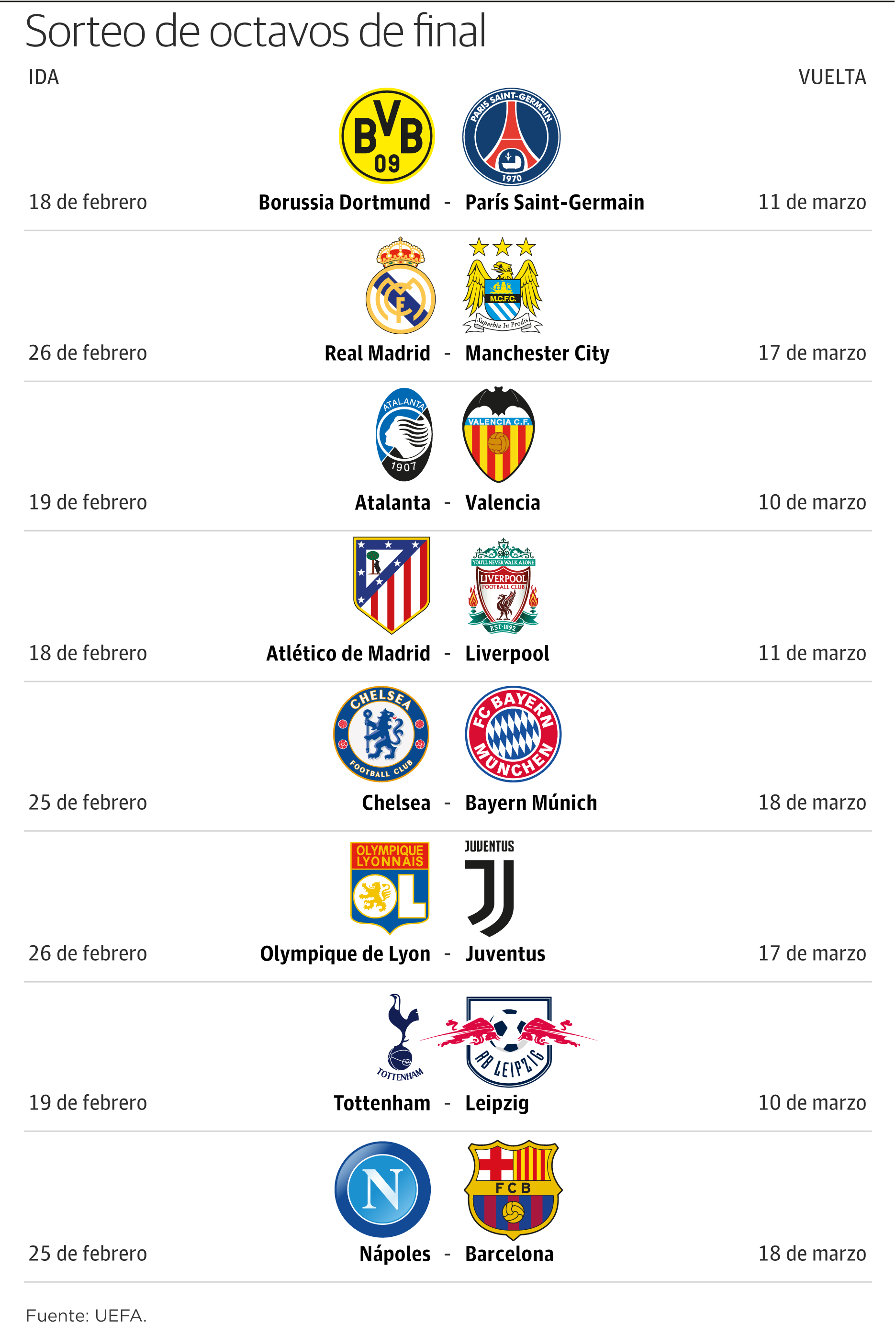 En unos octavos de final de elevadísimo tonelaje que completarán los duelos Borussia Dortmund-PSG, Chelsea-Bayern de Múnich, Olympique de Lyon-Juventus y Tottenham-Leipzig, los pulsos entre Real Madrid y Manchester City de un lado y Atlético y Liverpool por el otro se perfilan volcánicos.