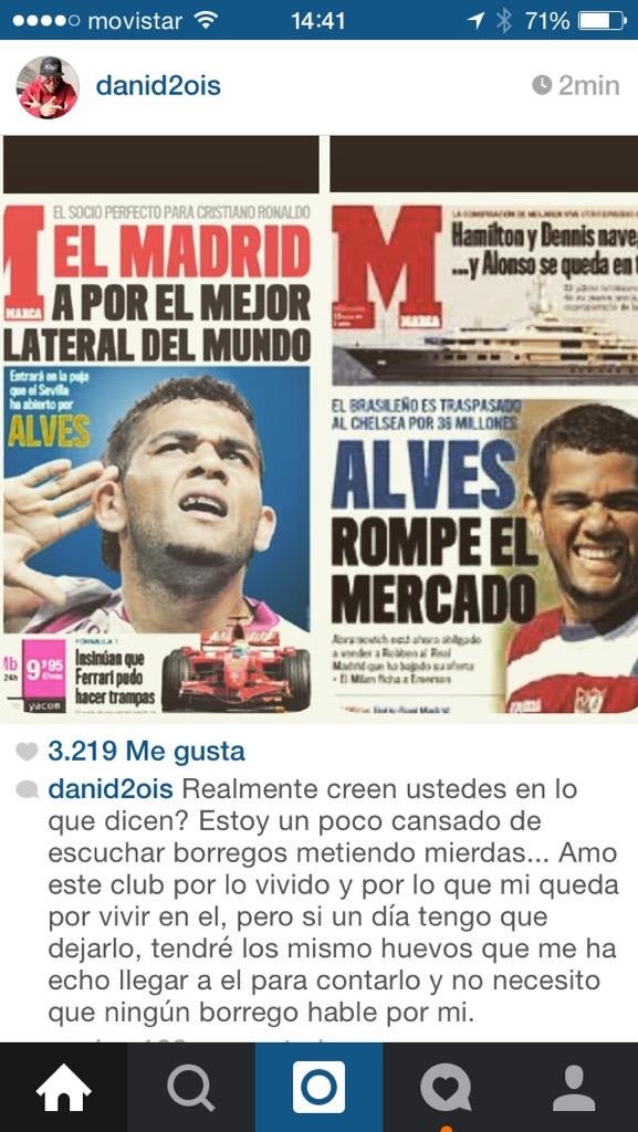 Dani Alves, que acaba contrato con el Barcelona en junio, criticó duramente a los medios de España que anunciaron su fichaje el miércoles por el PSG. El lateral brasileño aprovechó la red social de Instagram para negarlo, usando otras portadas de Marca, y llamando borregos a quienes lo hicieron.