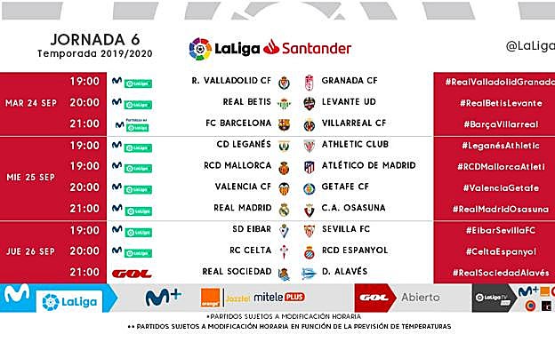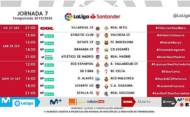 Por último, la 7ª jornada arrancará el viernes 27 de septiembre a las 21:00 horas con el Villarreal - Betis, el sábado será el Athletic el que dispute su partido a las 13 horas con el Valencia mientras que el derbi capitalino entre Atléticoy Real Madrid del Wanda Metropolitano será a las 21 horas.