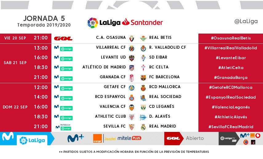 La 5ª jornada comenzará el viernes 20 de septiembre a las 21:00 horas en El Sadar (Osasuna - Betis) y concluirá el domingo 22 a las 21:00 horas en el Ramón Sánchez Pizjuán (Sevilla-Real Madrid).