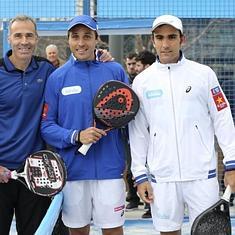Fernando Belasteguín (2d) y Pablo Lima (d) junto a Carlos Moyá (i) y Álex Corretja (2i).