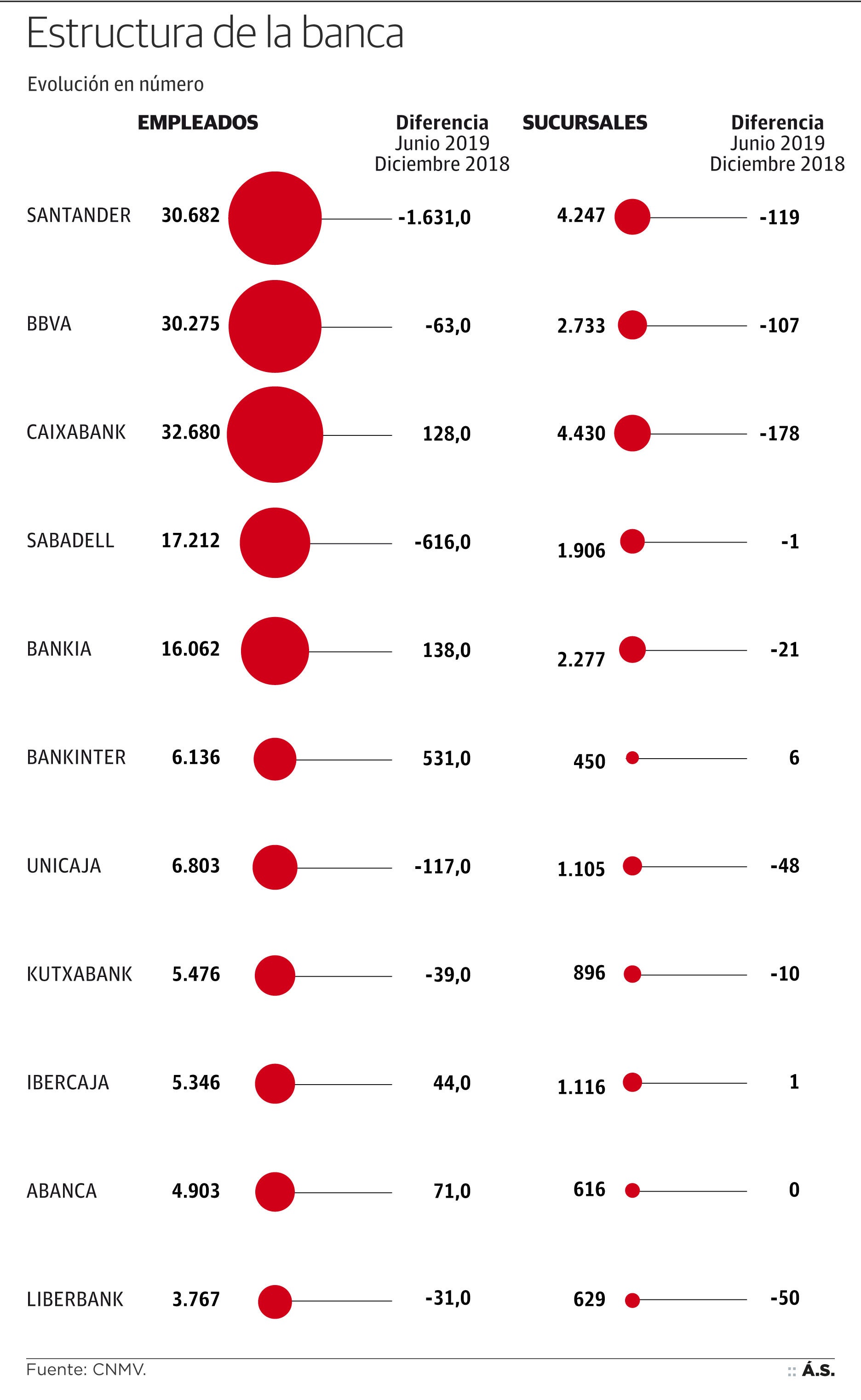 Los ajustes de personal de las entidades no ha sido mayor que el de otros trimestres similares de los últimos ejercicios, al haberse registrado un descenso medio que ha llegado a alcanzar el 3% en algunos peridos. Al finalizar el segundo trimestre las 11 corporaciones con mayor volumen de negocio (Santander, BBVA, CaixaBank, Sabadell, Bankia, Bankinter, Liberbank, Unicaja, Ibercaja, Abanca y Kutxabank) contaban con 159.652 empleados, frente a los 160.998 de finales de 2018.