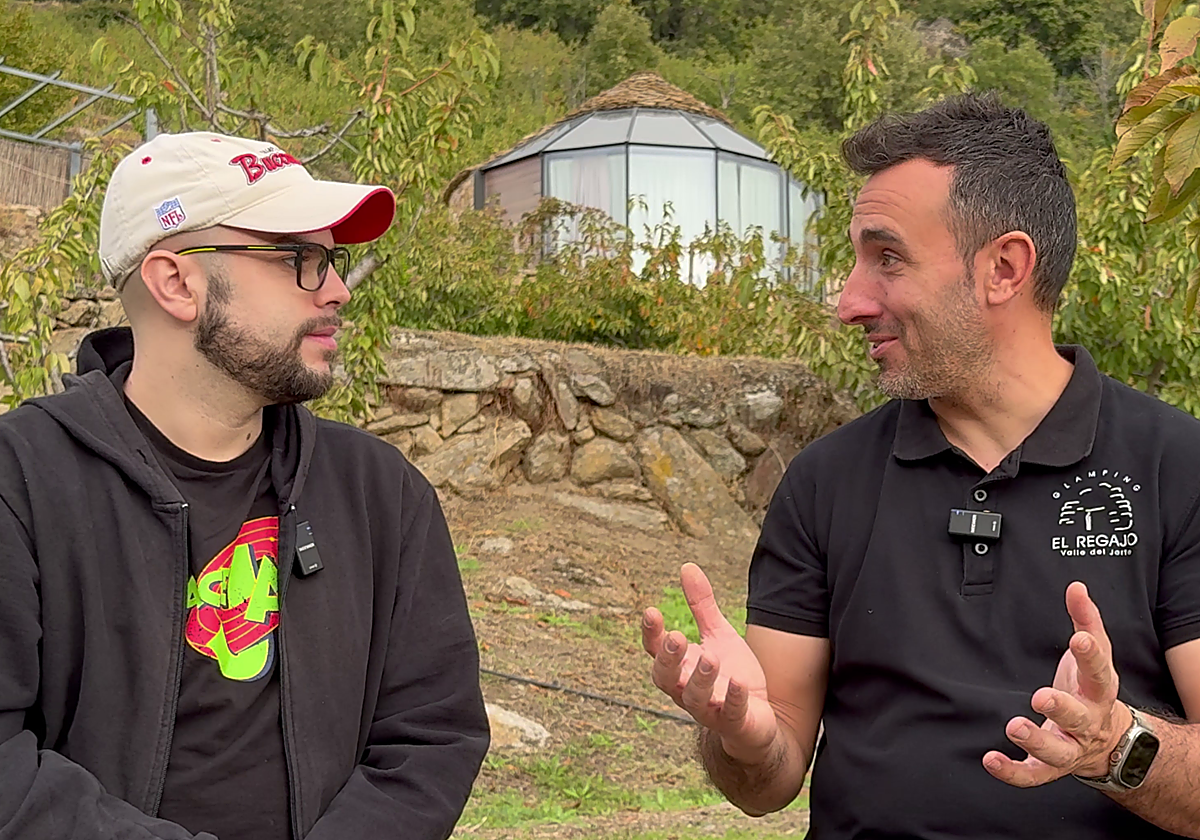 - Sigue adelante. Para mí era un sueño. Donde está ese chozo de ahí, antes había un cerezo de casi 6 metros de diámetro. Ahora los cerezos son más pequeños porque la mano de obra es más complicada, y la producción se hace en cerezos más manejables. Cogiendo cerezas en aquel cerezo, dije: «Wow, qué vistas hay desde aquí para poder levantarte por la mañana, poder montar aquí algo». Y así nació la idea de hacer los chozos. Es verdad que aquí en la Sierra del Torno hay 145 chozos de pastores censados y declarados patrimonio histórico cultural por la Junta de Extremadura. Así que era como volver a las raíces, convertirlo en una recreación de los chozos, una versión 3.0, la versión glamping. Choos habitables para la gente, pero que realmente vienen de los chozos de la sierra. Le dimos una vuelta al tipo de alojamiento que íbamos a montar, y vuelvo a lo mismo de antes: si lo haces con corazón, con ilusión y con ganas, sigue para adelante. No lo dudes.