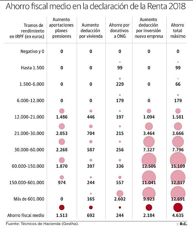 Pero los que saldrán más beneficiados son «los contribuyentes con mayores ingresos y patrimonio», que pueden aprovechar al máximo las deducciones previstas en el IRPF, según el sindicato. En concreto, las mayores ventajas fiscales las aprovecharán sobre todo los 91.408 contribuyentes que declaran ganar más de 150.000 euros al año. Para el resto, se pueden exprimir estas deducciones y ahorrar más de 4.600 euros de media pero siempre que se tenga algo de dinero ahorrado. De hecho, los técnicos recomiendan que antes de movilizar un capital, se sepa el ahorro fiscal máximo que se puede lograr en su carga real de IRPF. Esto es el importe de la cuota resultante de la autoliquidación, ya que Hacienda solo devuelve las retenciones.