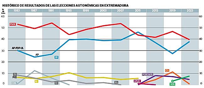 La noche electoral mostró a un PSOE hundido por el retroceso de Guillermo Fernández Vara y a un PP eufórico por las opciones de María ... Guardiola de ser la primera presidenta de la Junta de Extremadura. Los días posteriores y el cruce de declaraciones entre los populares (con su presidente nacional, Núñez Feijóo, como protagonista incómodo) y Vox han puesto en evidencia que la formación del Gobierno regional no va a ser tan sencilla. Pero los datos del 28 de mayo, más allá de su traslado a la representación parlamentaria, ponen de manifiesto un notable cambio de rumbo en la región.