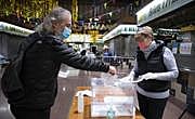 Nagore, una vitoriana de 21 años que trabaja en un laboratorio farmacéutico en Barcelona, preside la mesa. Junto a ella los dos vocales, Christian Díaz, arquitecto de 39 años, y Nil un joven de 21 años que estudia producción musical en Gerona. Los tres corroboran la tranquilidad de la jornada. «Todo está muy bien organizado. Nos sentimos protegidos con el material sanitario que disponemos aunque tienes la preocupación de que vas a estar expuesta durante muchas horas, delante de cientos de personas que te hablan o se acercan y que nunca sabes si te van a contagiar y tú, a su vez, vas a poder contagiar a otros cuando regreses a casa», dice la boticaria vasca, que reconoce la ventaja de 'trabajar' en un mercado ventilado, con todas las puertas abiertas de par en par y donde no deja de correr el aire, que aunque se cala en los huesos por la humedad, se percibe como una especie de barrera contra el virus.