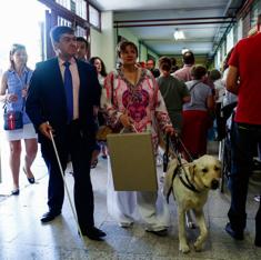 Un matrimonio entra al colegio electoral acompañado de su perro guía.