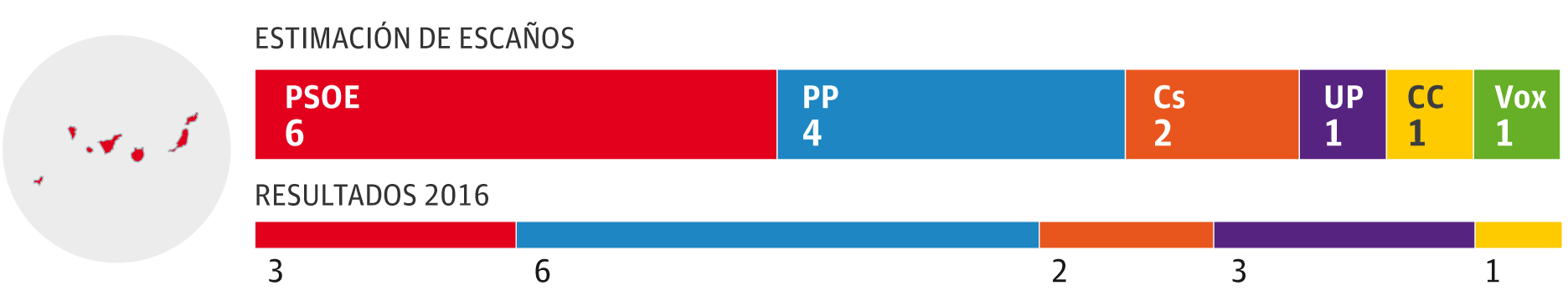 Las Islas Canarias tampoco se resisten al vuelco electoral a favor del PSOE y en detrimento del PP. Los socialistas pasarían el 28-A de tener tres diputados junto a su socio de Nueva Canarias a los 6, mientras que los populares caerían dos y se quedarían en cuatro. Ciudadanos sería la tercera fuerza al lograr tres actas. Coalición Canaria lograría otra para Ana Oramas.