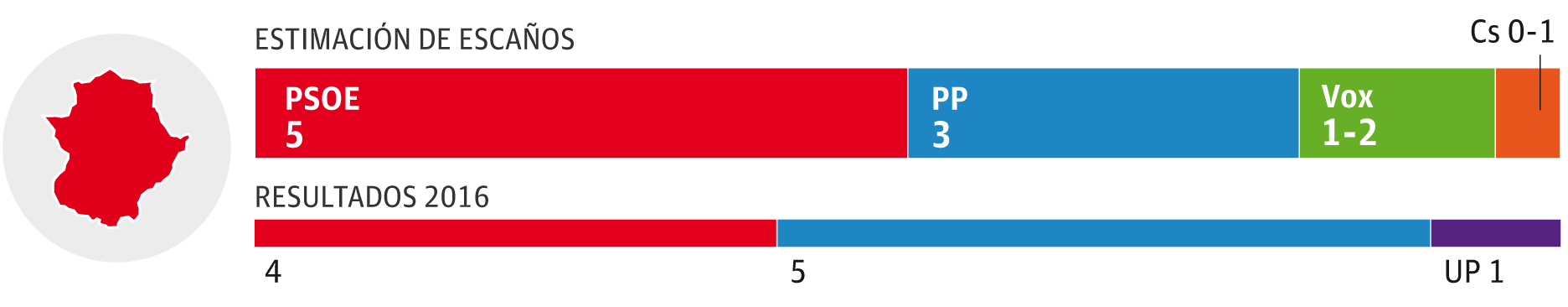 El PSOE lograría la victoria en las dos provincias extremeñas, lo que supone voltear los resultados de 2016. Obtendría 5 de los 10 escaños, debido en parte al descenso de Unidas Podemos que en las anteriores elecciones. La caída del PP sería importante, aunque se mantiene la incógnita respecto a qué partidos se aprovecharán de su retroceso: Ciudadanos roza el diputado y Vox podría alcanzar dos.
