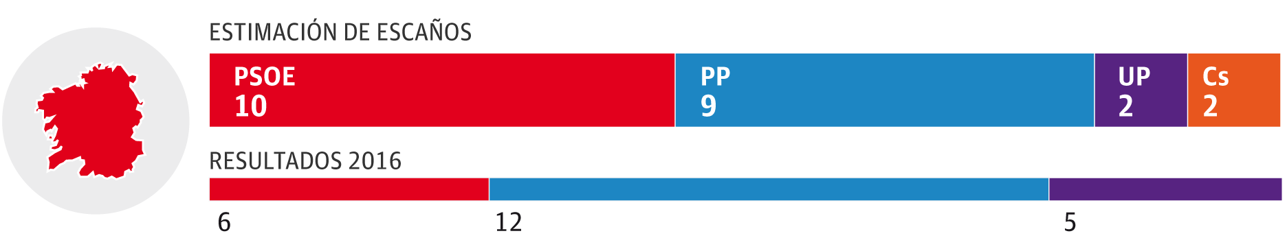 Los populares ni siquiera aguantan el tirón del PSOE en uno de sus feudos históricos y donde cuentan con la única mayoría absoluta en un parlamento autonómico. Los socialistas se imponen con diez escaños frente a los nueve de los conservadores. Unidas Podemos paga su ruptura con En Marea y pierde tres de las cinco actas que sumó en las anteriores generales.