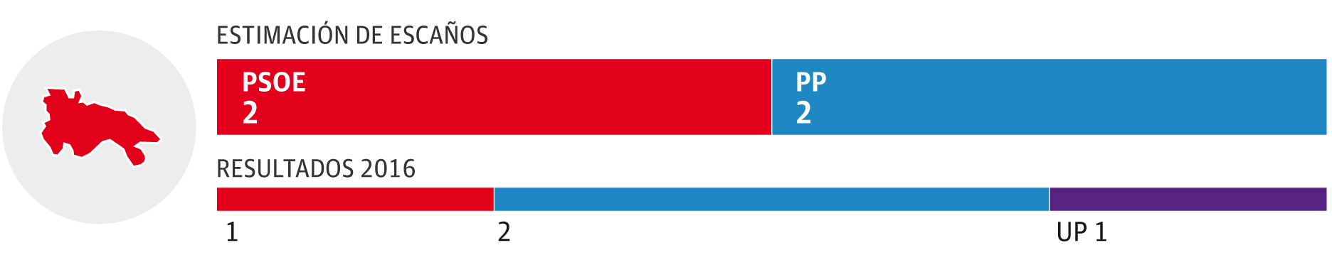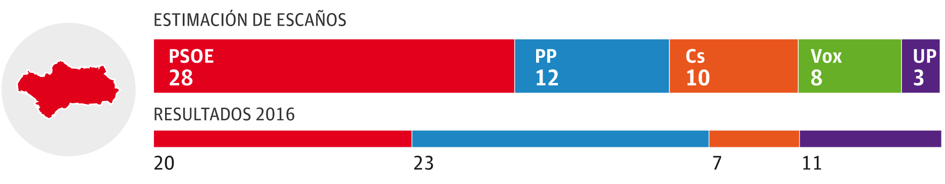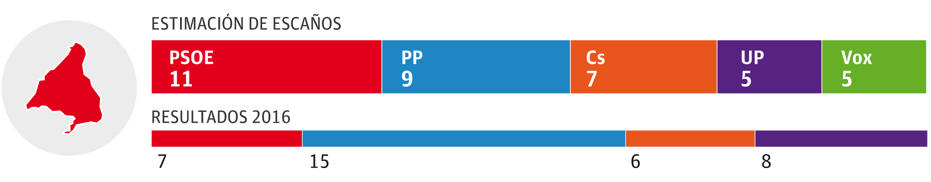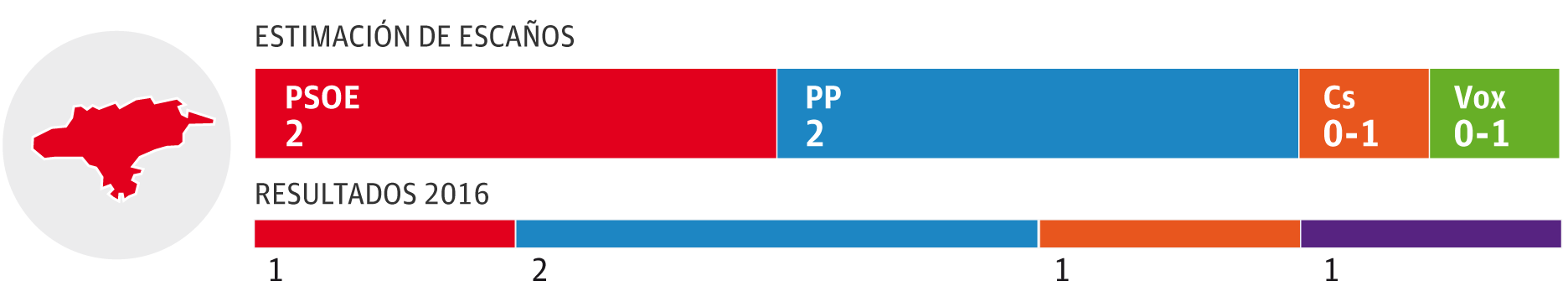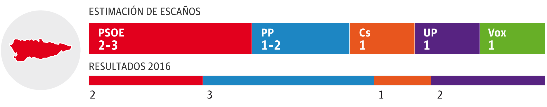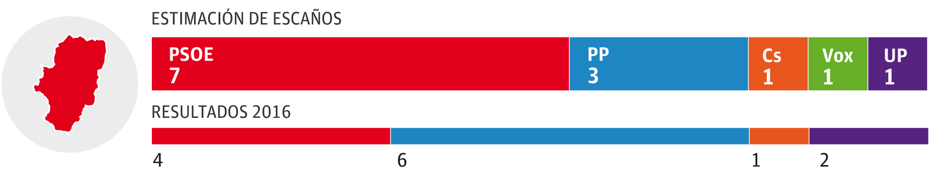 El PSOE ganaría con claridad y obtendría entre dos y tres escaños, por delante de una coalición de PP y Foro que se movería entre uno y dos y del resto de formaciones en liza, que lograrían un parlamentario cada una: Ciudadanos, Podemos y Vox. La encuesta pronostica que un escaño 'baila' entre el PSOE y PP-Foro. En porcentaje, los socialistas superan en once puntos a la coalición de la derecha.