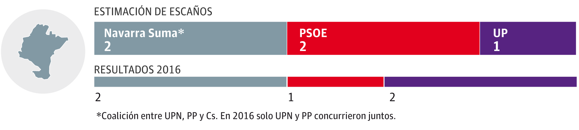 La alianza de centro derecha entre UPN, PP y Ciudadanos no puede tampoco con el PSOE. La coalición y los socialistas se llevarían cada uno dos de los cinco escaños que se reparten en esta comunidad. El restante sería para Unidas Podemos que cede uno de sus dos diputados en favor del PSOE. Vox paga su defensa del centralismo y no obtendría botín alguno en Navarra.