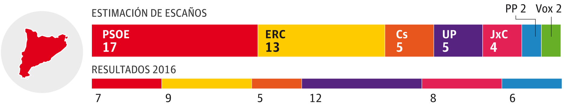 La resurrección de los socialistas catalanes augura una lucha intensa con Esquerra Republicana por ser la primera fuerza política en Cataluña. Según la encuesta de GAD3, el PSC alcanzaría los 17 diputados, un resultado que le acerca a sus mejores momentos electorales en una comunidad autónoma que apuntaló junto a Andalucía cada una de sus victorias electorales del pasado. Los republicanos se quedarían en 13 representantes, si bien se consolidan como primera opción independentista ante un Junts per Catalunya que se queda en tan solo cuatro. La lista apadrinada por Carles Puigdemont corre peligro de caer en la irrelevancia, lo que amenazaría con abrir una guerra interna en la antigua Convergència. Por contra, un buen resultado de Esquerra podría convertir a esta formación en socio indispensable de un futuro Ejecutivo de Pedro Sánchez. De momento Oriol Junqueras ya ha adelantado que no impondrá líneas rojas a cambio de apoyar la investidura del candidato socialista. Ciudadanos estaría en el camino de la decepción. Los liberales fueron los más votados en las últimas autonómicas, pero el 28-A se quedaría en los cinco escaños que ya obtuvo en 2016. No le va mejor a Unidas Podemos, que de partido más votado en las anteriores generales sería ahora el tercero o cuarto, con los mismos cinco diputados que los de Albert Rivera.