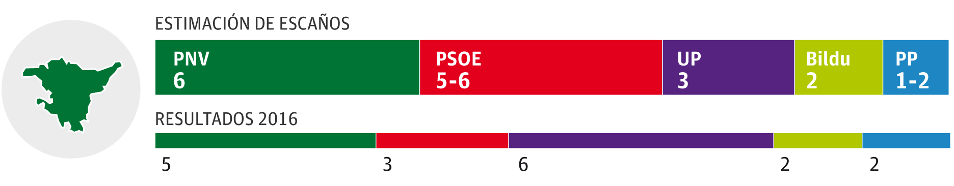El PNV será la formación más votada aunque podría empatar en escaños con un PSE al alza. Unidas Podemos, ganador en los comicios de 2016 en Euskadi, baja de seis a tres diputados. Tampoco se vislumbra un buen resultado para el PP que podría perder su escaño en Álava, al que aspira el exalcalde de Vitoria Javier Maroto. Ciudadanos y Vox no obtendrían representación.