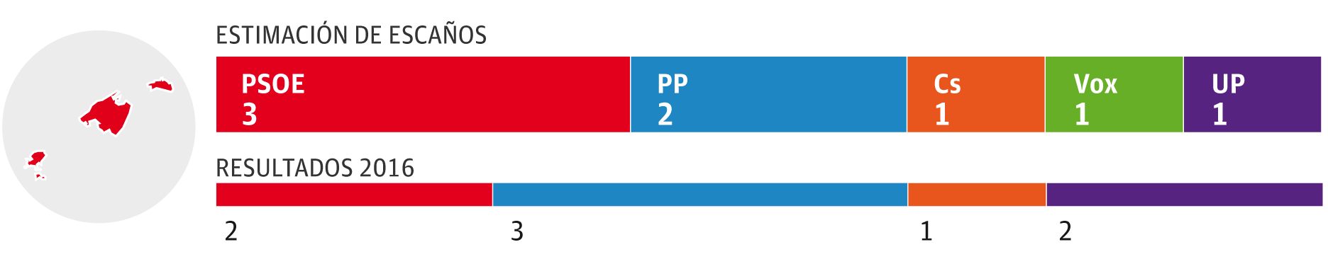 Representación muy repartida en Baleares, donde las cinco principales fuerzas políticas obtendrían al menos uno de los ocho escaños que se reparten en el archipiélago. El PP cedería la primera posición a los socialistas, que se llevarían tres diputados por dos de los conservadores. Unidas Podemos, Ciudadanos y Vox obtendrían cada uno un representante en el Congreso.