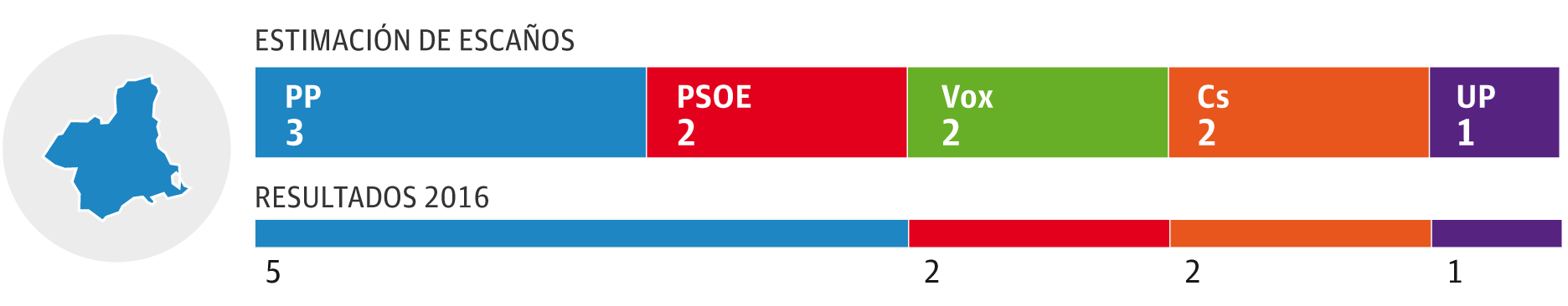 El PP se deja hasta cinco diputados en Castilla-La Mancha y se quedaría con tan solo siete tras las generales. Como consuelo, los populares logran casi el empate con el PSOE, que de los siete escaños que tenía esta legislatura pasa a ocho. Vox irrumpe con fuerza en esta comunidad autónoma al tener opciones de lograr hasta tres representantes en la Cámara baja.