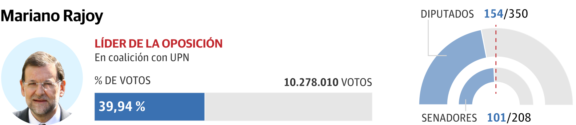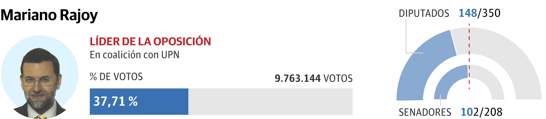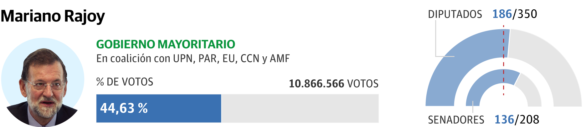 A lomos de una pésima gestión socialista de la crisis económica, Rajoy consiguió llegar a la Moncloa al tercer intento. Lo hizo además con una amplia mayoría absoluta y con los socialistas hundidos y sin Zapatero. El nacionalismo quedó reducido a un papel testimonial pese a su fuerte presencia, mientras UPyD amagó con ser una fuerza emergente.