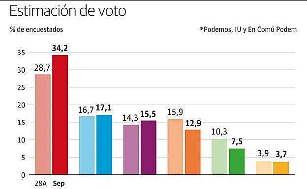 En concreto, el CIS calcula al PSOE una estimación de voto del 34,2%, casi cinco puntos y medio (5,52) por encima de su resultado del 28 de abril., pero por debajo del 41,3% en intención directa de voto que registró en julio.