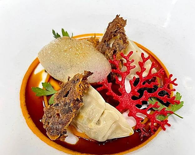 En primer lugar, el chef y propietario del restaurante emeritense Agallas Gastro & Food modernizó una receta clásica de bacalao, «la que me hacía mi abuela cuando era pequeño», recuerda. Y en segundo, unas gyozas de ternera con gelatina de teriyaki con demi-glasse de ternera, patatas revolconas en la base, crujiente de oreja de cerdo y la grasa de la tapilla (la pieza con la que debían trabajar en el concurso) coronando el plato en forma de árbol.
