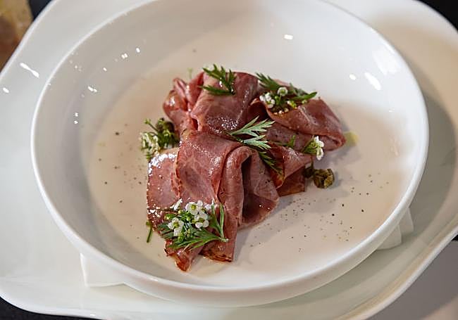 Además, el chef placentino rindió homenaje a Italia incluyendo en el pan los colores de su bandera: el verde del pistacho, el blanco de la trufa y del pecorino, y el rojo de la pasta de tomate. Para crear este plato se sirvió de referencia un pase del menú degustación del triestrellado Atrio, el 'vitello tonnato', según cuenta a En Salsa.