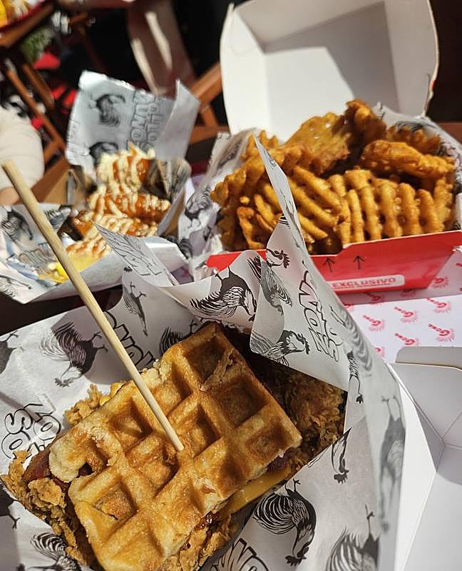 Allí, pegada a El Corte Inglés, han montado una especie de granja en la que cocinan dentro de una brillante furgoneta amarilla dos hamburguesas de pollo extra crujiente por fuera y jugoso por dentro (la 'Chicken Waffle', que sustituye el pan de hamburguesa por gofre y la 'Chicken Burger', acompañada de salsa buffalo, tártara pimentón de La Vera). También unas alitas de pollo con dos cocciones y patatas rejilla con lima tajín. Como postres, se ofrecen dos alternativas: una nueva versión de la famosa tarta de queso de la Pedroche con pimienta de Sichuan y un bizcocho fluido, elaborado con chocolate negro belga al 70% de cacao, crema de galletas remojadas en leche, caramelo, chantilly de vainilla y yuzu. Todo muy gocho o, como diría él, «goxo». Se puede tomar allí, en una terraza improvisada en esa explanada, o también recoger para llevar.