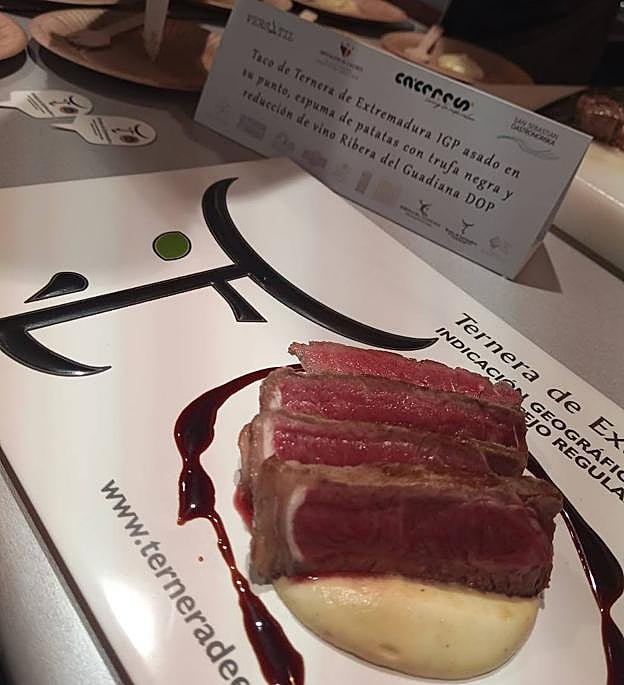 Por tanto, el chef del restaurante de Zarza de Granadilla ha fusionado los mejores productos extremeños para crear un sorprendente resultado final, que han podido degustar los asistentes de Gastronomika. Por ejemplo, ha elaborado un mini canelón relleno de caldereta extremeña de Cordero IGP de Extremadura Corderex, con bombón de queso de Torta del Casar, membrillo y jugo de perejil. O también un lomo de cordero asado en plancha, con cremoso de berza, tosta crujiente, jamón y queso de las Ibores.