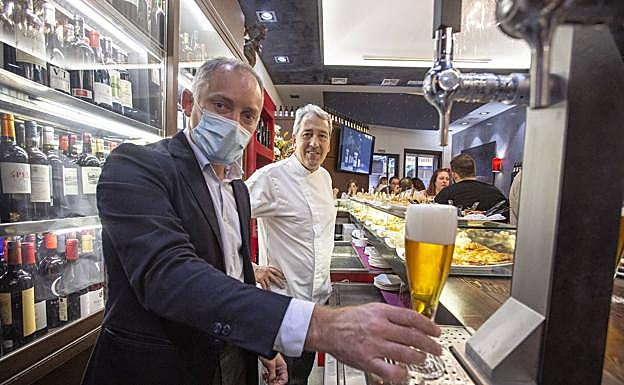 El cocinero donostiarra y propietario del local, Pablo Medrano, ejerció de anfitrión en el acto de estreno de su nuevo cañero. En homenaje a su tierra maridó la cerveza y agasajó al cliente con una barra repleta de 'pintxos', pequeños pero suculentos bocados de tortilla de bacalao, croquetas, chistorra o la popular gilda.