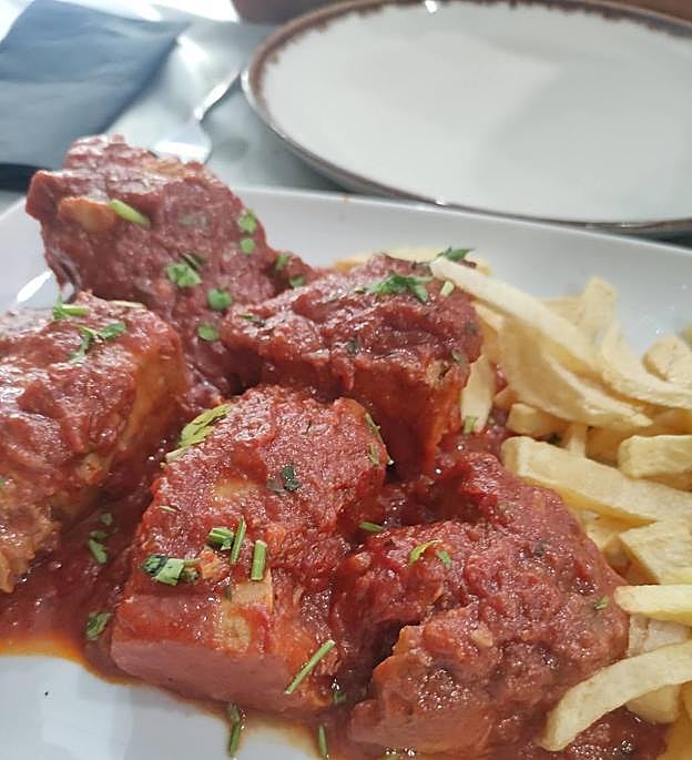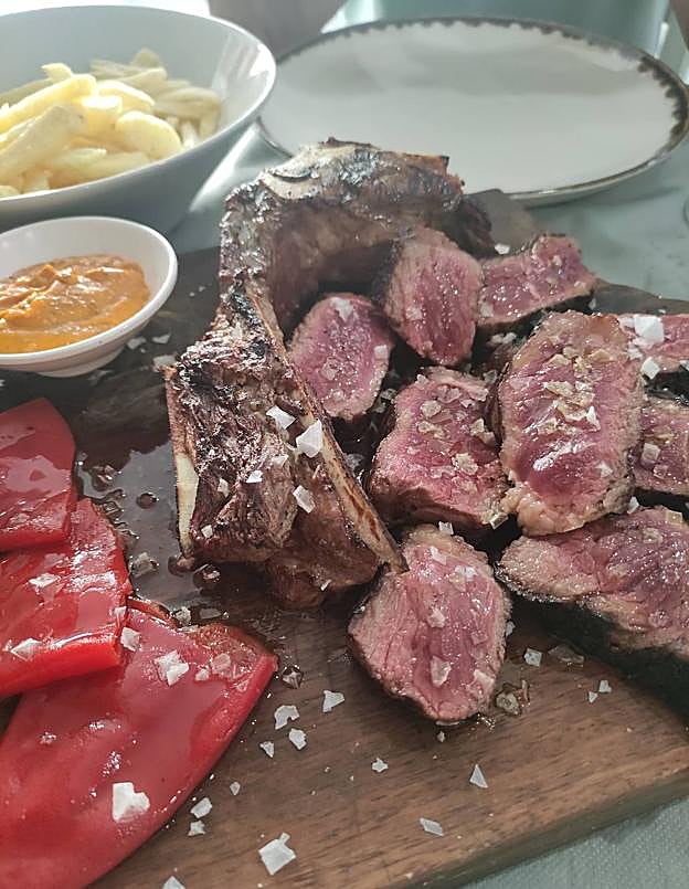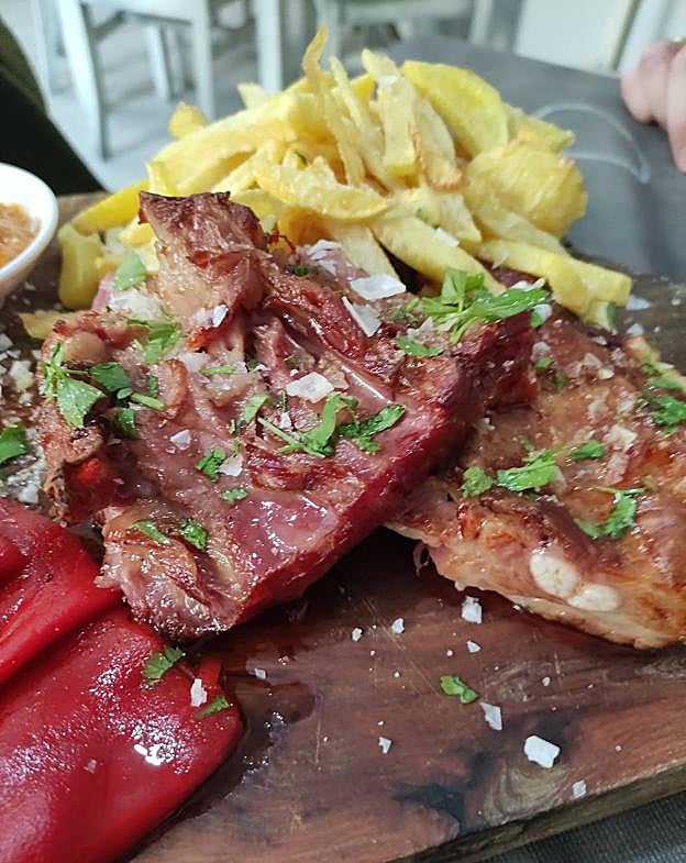 Entre las carnes hay que destacar los distintos cortes de ternera. En nuestro caso un T-Bone de vaca, bien de punto, acompañado de unas ricas patatas fritas y pimientos de piquillo. Muy mejorable un costillar de ibérico cocinado a baja temperatura y terminado al horno. Aunque tenía un exceso de sal quizás, el mayor problema, era que la personalidad del producto, debido a la cocción al vacío y su pobre terminación en cocina se encontraba totalmente difuminada.