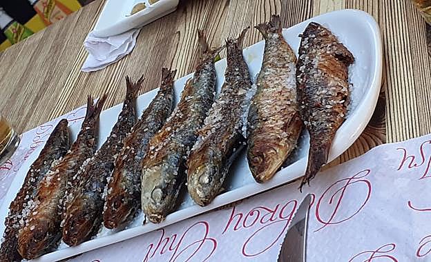 Pero hablemos de comer. De carne y pescado. Lo mejor suele estar en el fuera de carta, donde lo mismo te cantan unos salmonetes de roca, un tartar de salmón, unas navajas que unas pijotas o almejas. Con suerte, ese día también han encargado chuletillas de palo o pinchos de cordero, celebrados a menudo.