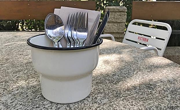 Detalles: frasca de agua gratis, cervezas bien tiradas, rico pincho de ensaladilla de cortesía delicadamente emplatado, buen pan de masa madre de Villanueva de la Vera, mantelitos de rafia, servilletas de papel y un práctico cubilete con cubiertos que colocan en la mesa y te vas sirviendo a tu gusto de cucharas, tenedores y cuchillos.