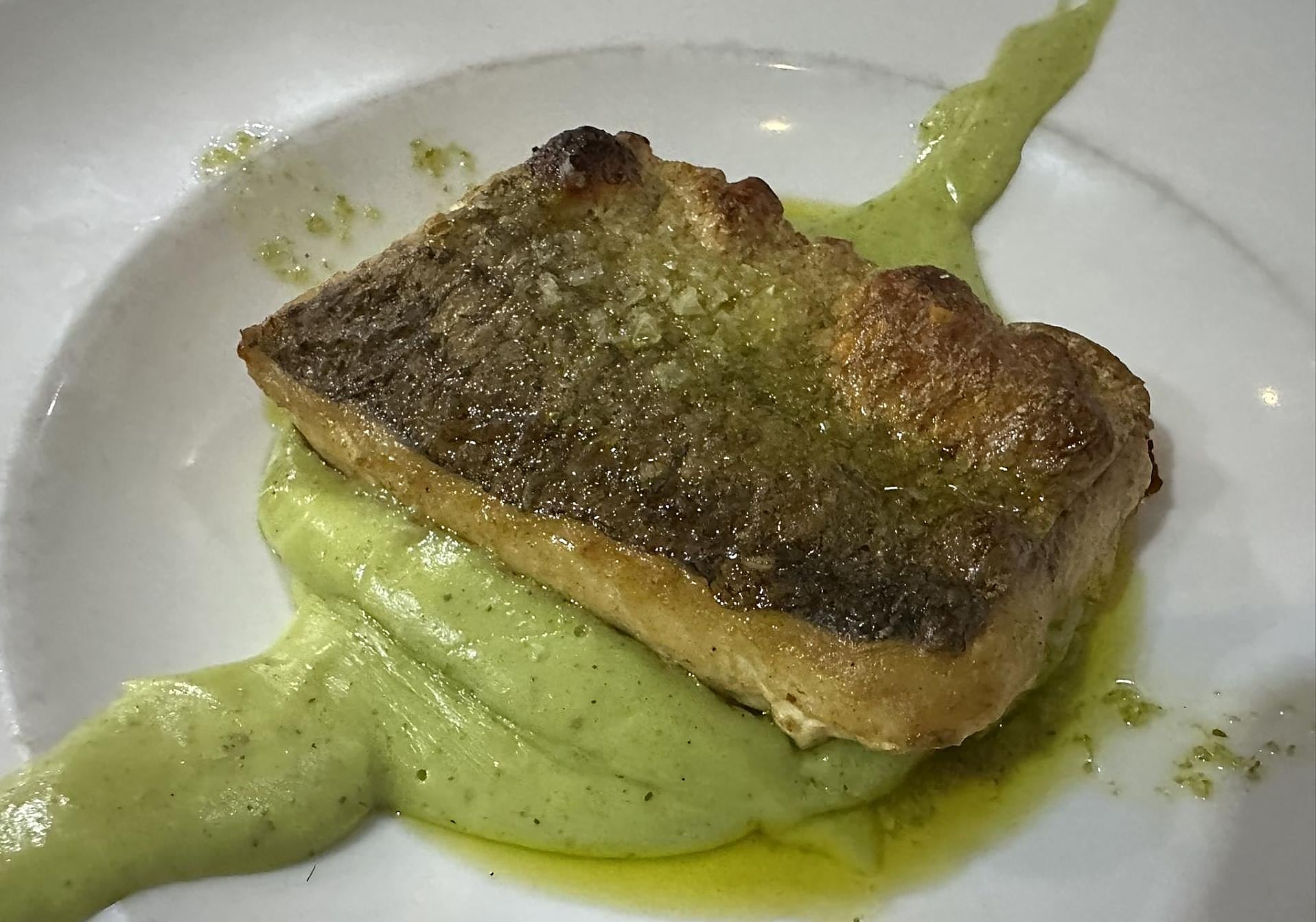 Para terminar con la parte dedicada a los productos marinos, pedimos una merluza al Josper con parmentier verde y algas. Buen tamaño el de la merluza, que estaba ligeramente pasada de punto, por lo que había perdido su textura característica, que es casi lo más interesante de esta especie. El parmentier lo complementaba adecuadamente y hacía más jugoso el conjunto.