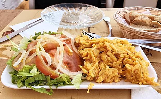 No falta el bacalao dorado, que llega a la mesa en una bandeja de loza blanca. A un lado, un jugoso, rico y suave bacalao dorado con buenos trozos del pescado nacional portugués, nada de miguitas y migajas. Al otro, una ensalada mixta. No comen dos, pero el precio es de tapa barata, no de ración espectacular. Los jóvenes de otras mesas cenan antes de salir de fiesta suculentos bitoques (lomo de cerdo con huevo frito y patatas fritas), bifanas (bocadillo de lomo con patatas fritas), huevos con morcilla farinheira o platos de cacholeira y de lingüiça, típicos embutidos lusos, asadas.