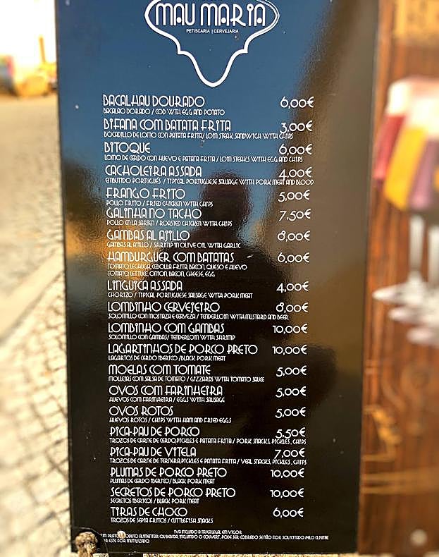 Ya hemos avisado de que se trata de una tapería sin alardes así que en su carta hay cinco referencias de vinos alentejanos y cervezas portuguesas y jarras de sangría. La carta se divide en dos apartados: À Chegada y Com Conversa. La primera sección engloba los entrantes, que se resumen en jamón, queso y sopa del día. Es en los platos para conversar donde reside la gracia de Mau Maria.