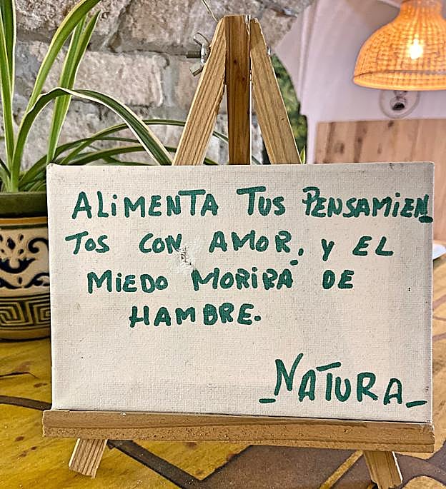 Esferas de arroz negro, alcachofas confitadas, esferas de Ferrero… El enunciado de los platos nos sugiere un restaurante gourmet, un comedor elegante y un maître sofisticado… Sin embargo, suena Rosendo, los camareros llevan camisetas negras y tejanos caídos, los manteles son individuales de papel, las mesas, de madera rústica, las sillas, cada una de su padre y de su madre, la cubertería es corriente, la cerámica se apunta a la informalidad y sobre los muebles, además de plantas, se ven tarjetas con mensajitos de buen rollo, por ejemplo: «Alimenta tus pensamientos con amor y el miedo morirá con el hambre».