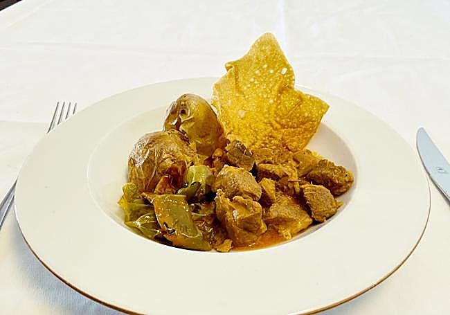 Seguimos con una caldereta de cordero con pimentón de la Vera que nos deja perplejos. Bien el cordero, bien su guiso, bien los pimientos que lo guarnecen. ¿Pero qué hace una insípida patata cocida con piel en el plato? ¿Por qué no están las patatas cortaditas y en el guiso, impregnándose de la salsa? Es verdad que hay calderetas sin caldo y sin patatas. Sea. ¿Pero esta patata insensata?