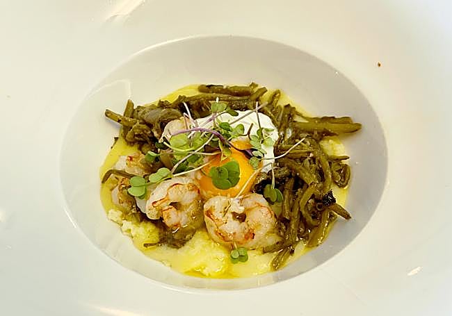 Animados por el ambiente tan regional, escogemos un menú muy de la tierra que empieza con unas tagarninas salteadas con gambas y huevos de gallina azul 100% raza autóctona. Y nos descubrimos ante la mezcla de sutilezas del plato. La delicada intensidad de la tagarnina, la suave delicia del huevo, la jugosidad de las gambas, a las que les faltaba un punto de sal para que todo su sabor yodado y marino se descubriera. Es, en fin, un plato valiente que hemos visto en pocos restaurantes: el Mesón La Fuente de Fuente del Arco y poco más, salvo que haya festejo local de la tagarnina o similar.