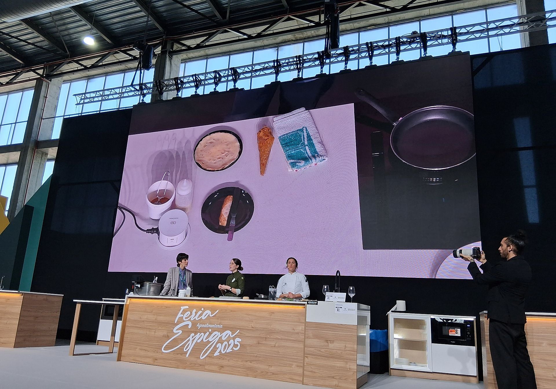 Una cocina montada para la ocasión, una cámara cenital enfocando a los fuegos y cacerolas y una pantalla detrás de los cocineros, en este caso cocineras, dan mucho juego. Que se lo digan al público que este viernes ha seguido las manos y las explicaciones de Carmen Peláez y Mercedes Rincón. La primera lleva los fogones del restaurante Acebuche de Zafra, la segunda se encarga de Macarraca, en Villanueva de la Serena. Los dos suenan con fuerza como punta de lanza de la gastronomía de autor en Extremadura. Los dos apuestan con decisión por los productos locales, como le fueron explicando a la periodista Alba Baranda esta mañana, encargada de dinamizar el primer showcooking que ha tenido lugar en la Feria Espiga que está celebrándose desde hoy y hasta el lunes en Ifeba, Badajoz.