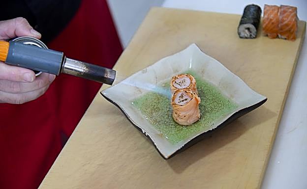 Así que verlo trabajar resulta embelesador. Actúa con precisión: corta, limpia, afina, limpia, decora, vuelve a limpiar, flambea... Y toda esta pasión y maña de artesano se traduce en piezas perfectas, diferentes entre sí, sabrosas, con un pescado fresquísimo y un arroz sin apelmazar. De hecho, este chef nos confiesa que es fácil conseguir un buen pescado, pues solo hay que comprarlo y pagar la mejor calidad. Sin embargo, considera que el 60% de un buen sushi es el arroz, que tiene que ser ligero, esponjoso y levemente pegajoso. Además, debe estar a la temperatura del cuerpo humano. Tercer secreto.