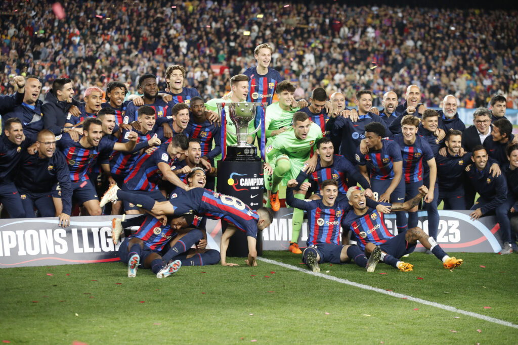 Los jugadores del FC Barcelona levantan la copa de campeones de LaLiga Santander 22-23.