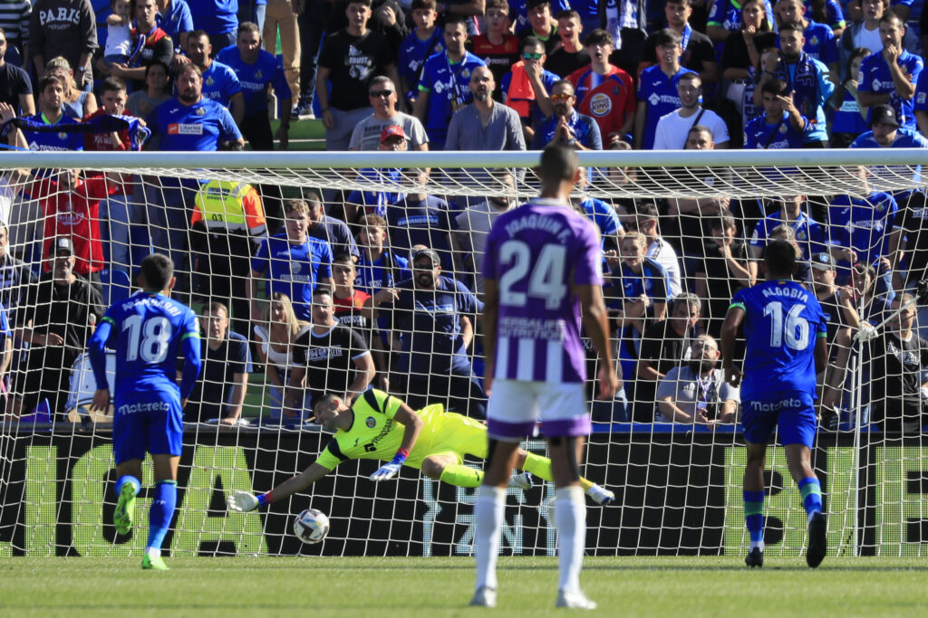 El portero del Getafe David Soria no puede parar el balón del delantero del Valladolid Sergio León.