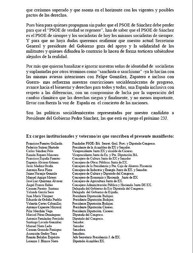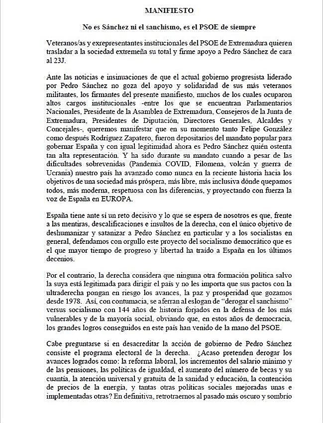 175 nombres, uno tras otro, firman un manifiesto de apoyo al presidente del Gobierno y candidato del PSOE a la reelección el 23-J. Son ... veteranos del partido, entre los que hay 81 que han desempeñado cargos de relevancia en la región. Son todos socialistas que acumularon el poder en los sucesivos gobiernos de Ibarra, aunque el expresidente no firme el documento.