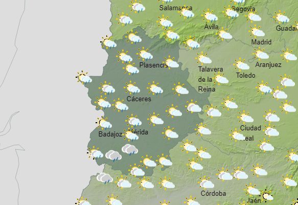 El inicio de semana llegará con subida en los termómetros, que alcanzarán los 33-34 grados en puntos de las Vegas del Guadiana y se elevarán hasta los 32 también en la provincia de Cáceres en ciudades como Plasencia. La Aemet prevé para lunes cielo poco nuboso con intervalos de nubes altas, y aumentando la nubosidad al final del día en el noroeste. Las rachas de viento soplarán del suroeste al oeste.