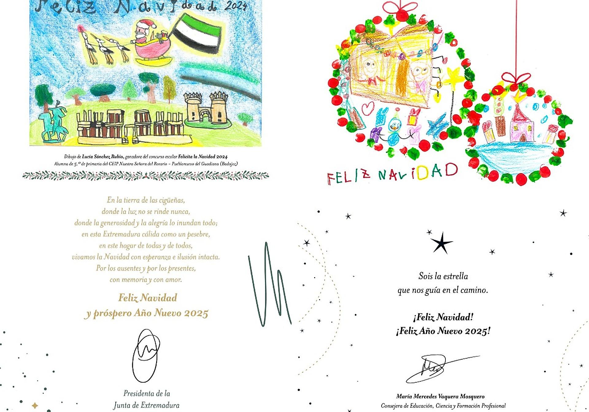 Por su parte, la consejera de Educación, Mercedes Mercedes Vaquera, ha enviado en otro mensaje su propia postal de Navidad a la comunidad educativa en la que recoge un dibujo de la estudiante Blanca Rivero Campos, también ganadora del concurso escolar 'Felicita la Navidad 2024'. Ella es alumna de Educación Infantil, de 5 años, del colegio Calzada Romana, del municipio pacense de Puebla de la Calzada.