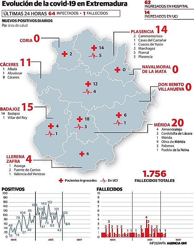 Por su parte, Cáceres registra once positivos. Nueve en la capital de provincia y los otros en Albalá y Alcúescar. Tiene doce pacientes ingresados, cuatro de ellos en UCI.