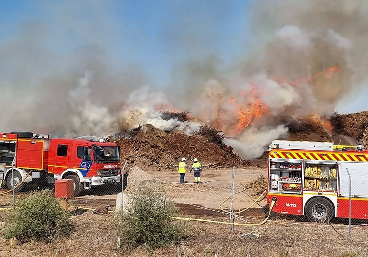Los bomberos intentan sofocar un aparatoso incendio en los exteriores de la planta de biomasa de Mérida