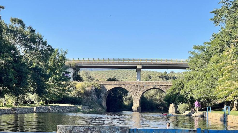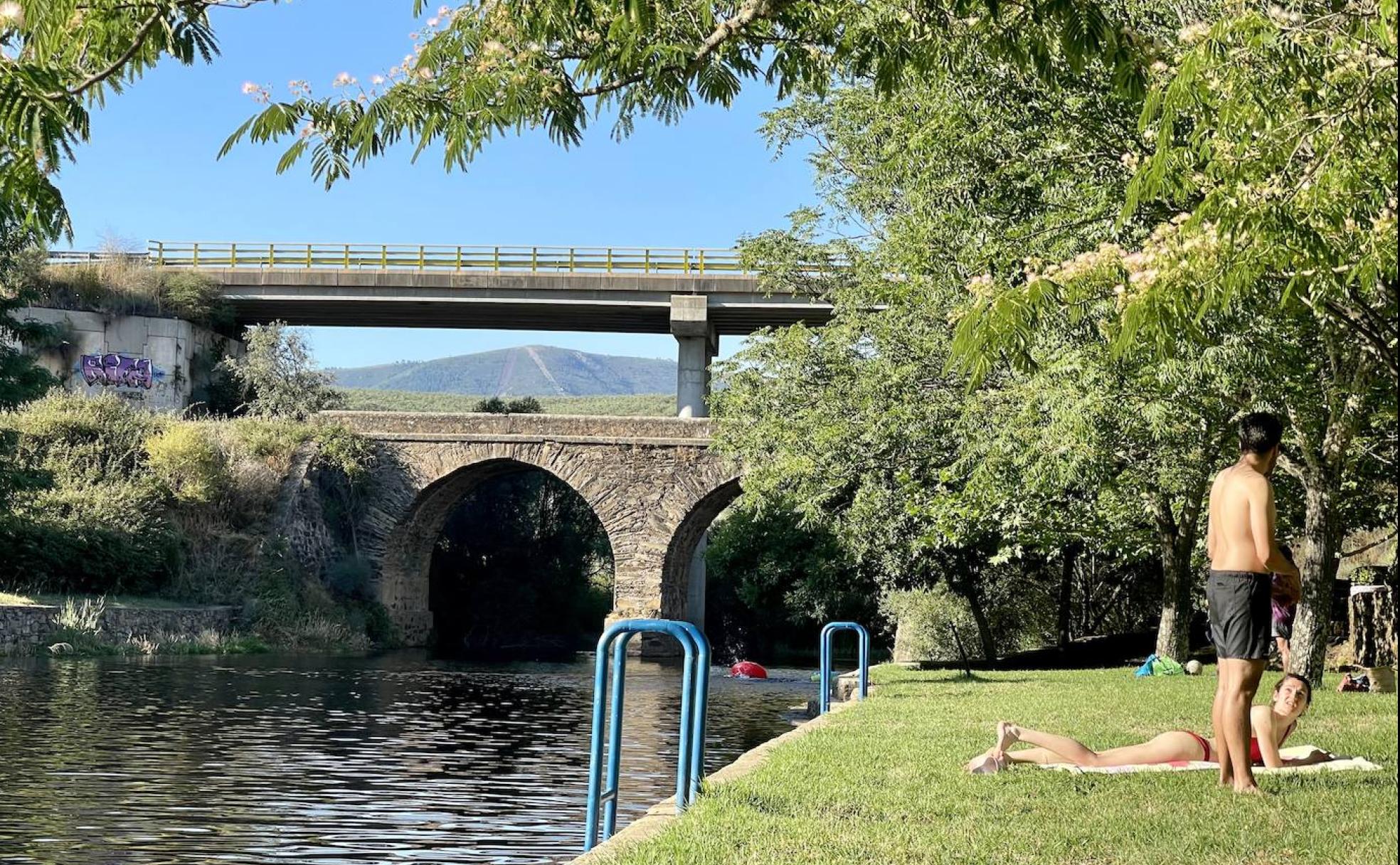 La piscina natural de Santibáñez el Alto es una sorpresa. Nada en la carretera provincial CC-115 –la de Montehermoso y Pozuelo de Zarzón– hace sospechar que bajo uno de sus puentes vaya a surgir un espacio tan acogedor. Es el río Árrago el que forma en este punto del norte extremeño una lámina de agua no demasiado conocida pese a que el acceso está bien indicado. Quizás ocurre que en la Sierra de Gata, a cuya mancomunidad pertenece este Santibáñez –no confundir con el Bajo, que está en la mancomunidad de Trasierra-Tierras de Granadilla– hay localidades y charcos más famosos, ubicados en las localidades más turísticas de la comarca, como Hoyos o Acebo. No significa esto que el lugar vaya a estar semivacío cualquier tarde de julio o agosto. Gente va a haber, seguro, pero no tanta como en otros destinos similares y cercanos.